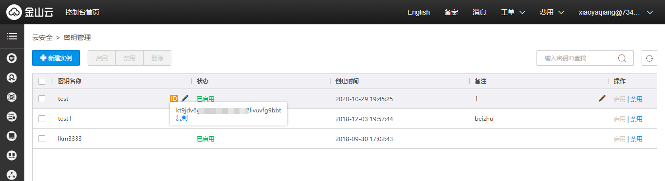访问控制台,鼠标放置该密钥实例上,移入【ID】图标,即可查看当前密钥ID,密钥ID唯一标识某一密钥实例