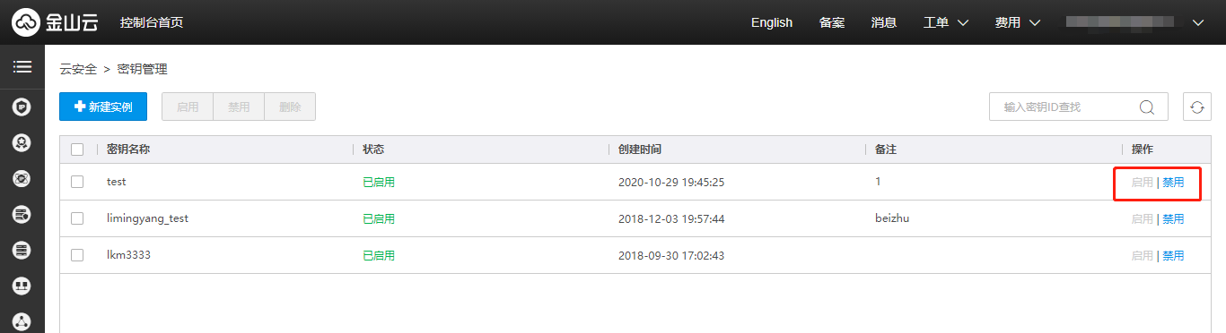 访问控制台,鼠标放置该密钥实例上,移入编辑图标,即可对该密钥实例的【密钥名称】、【备注】进行编辑、修改。注意:密钥名称不可重复。