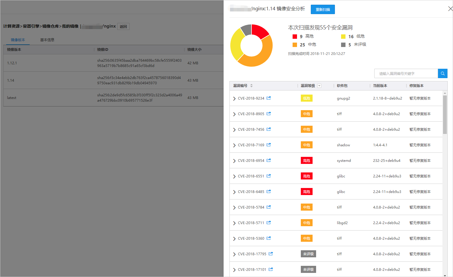 注:金山云容器服务通过每天同步NVD(美国国家漏洞数据库)、Debian Security Bug Tracker、Ubuntu CVE Tracker等CVE库中漏洞和补丁信息,为您的镜像安全提供第一时间的信息。