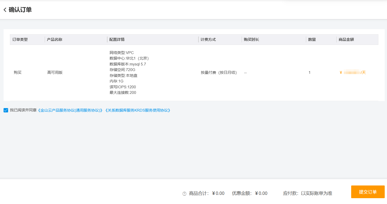 确认订单后,点击提交订单,付费后将为您创建实例。
