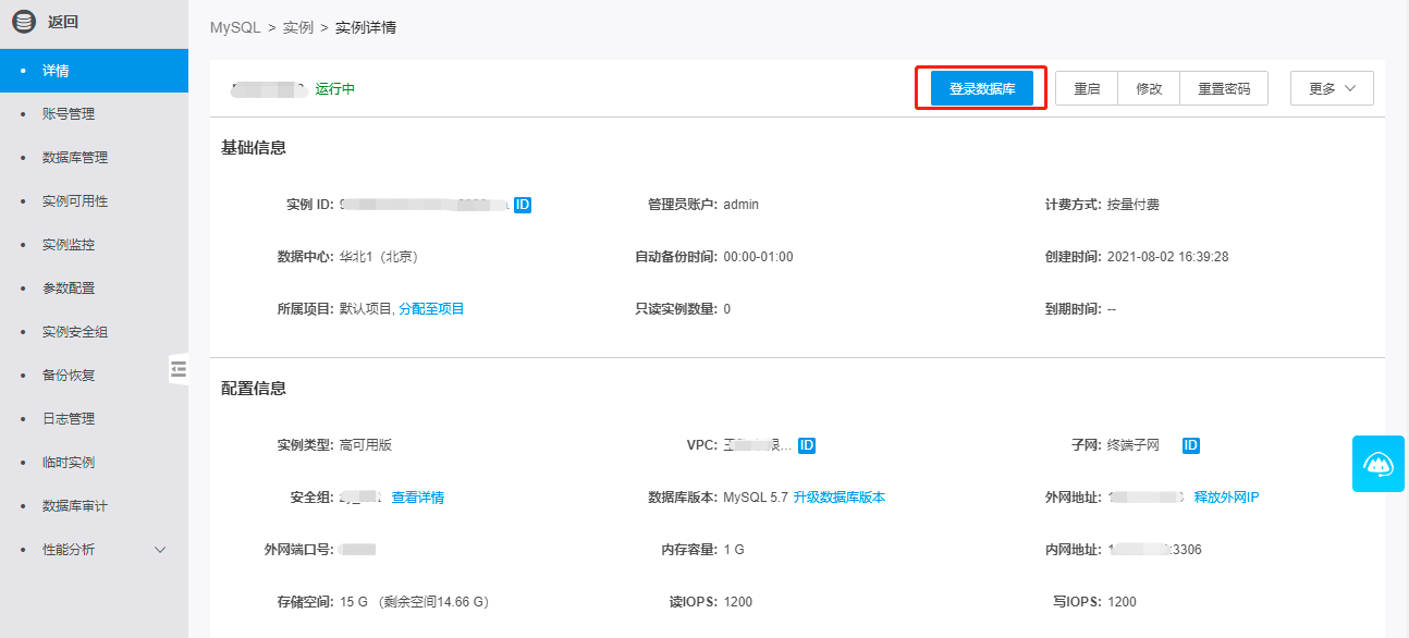 1.在金山云控制台中,依次单击数据库 > 云数据库MySQL > 实例。