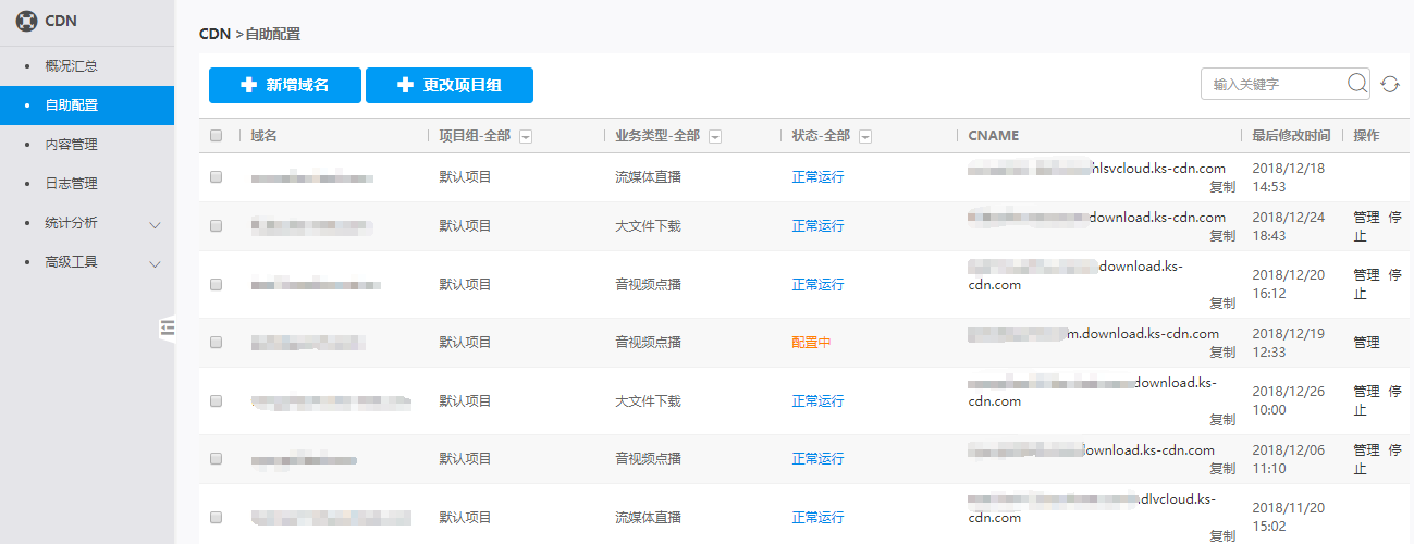 服务开通后,您可登陆CDN控制台,进入【自助配置】页面,点击【新增域名】,开始新增域名操作。