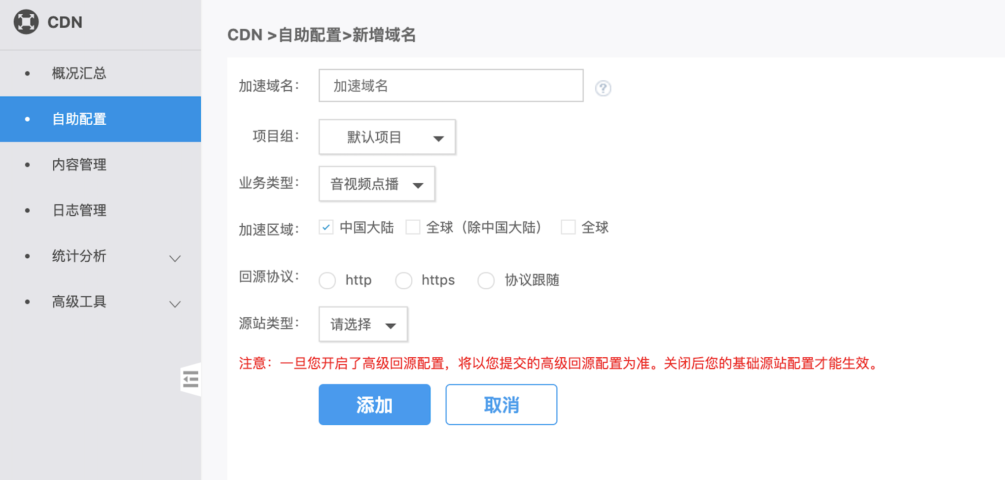 CDN控制台支持新增音视频点播、大文件下载、图片小文件域名。如果您需要增加RTMP、HLS和HDL(HTTP-FLV)直播域名,请前往云直播控制台上添加。