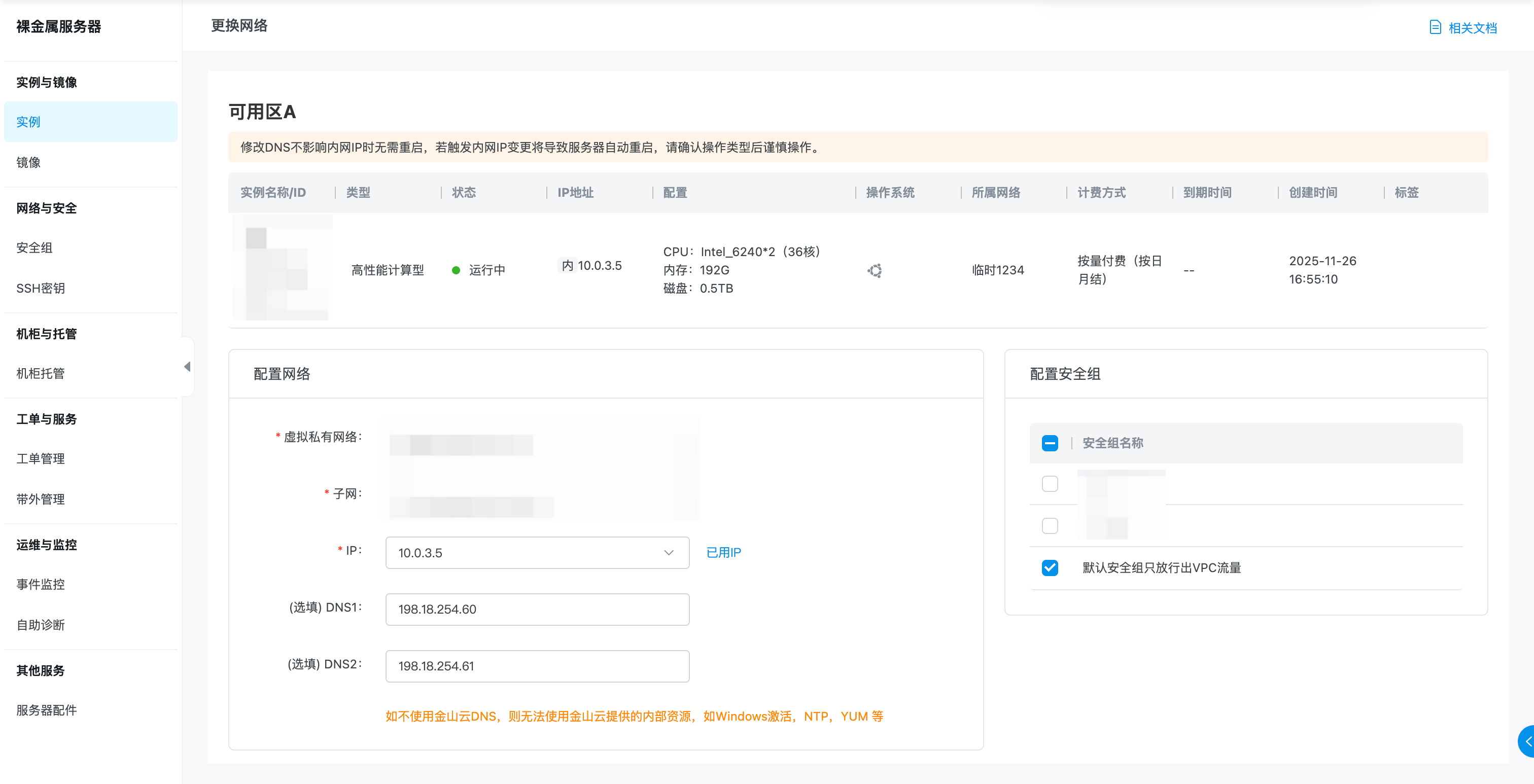 内网IP由系统统一分配,用户可以在控制台进行更换网络配置的操作。不支持在操作系统内部自行变更内网IP,否则会导致内网通信失败。