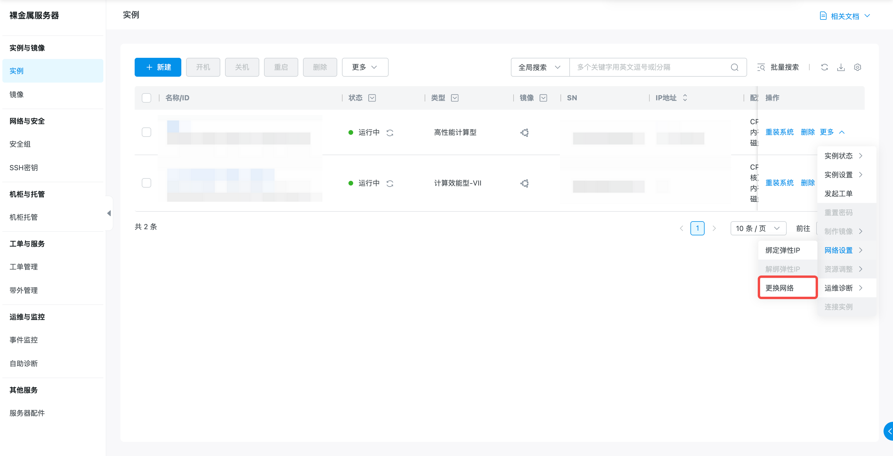 找到目标裸金属服务器,在对应的操作列中,选择更多> 更换网络。
