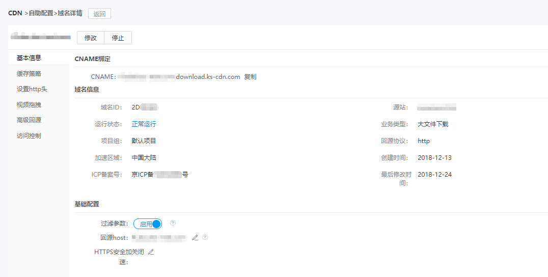 域名配置完成后,您可登陆CDN控制台,进入【自助配置】页面,点击【管理】操作,进行域名基础配置的修改及高级配置的配置与修改,配置详情见控制台使用手册。