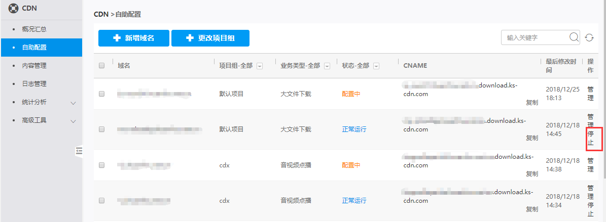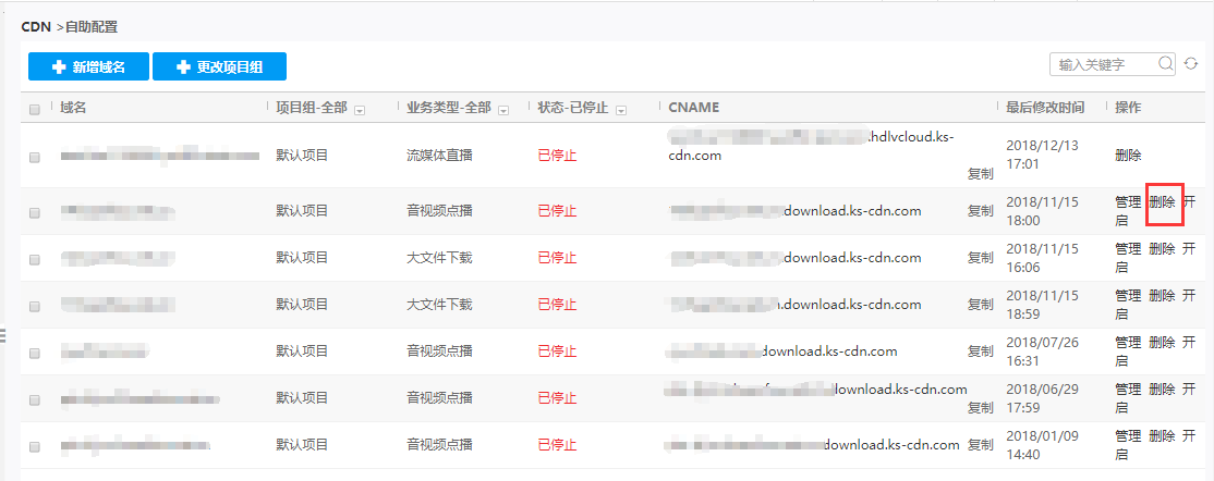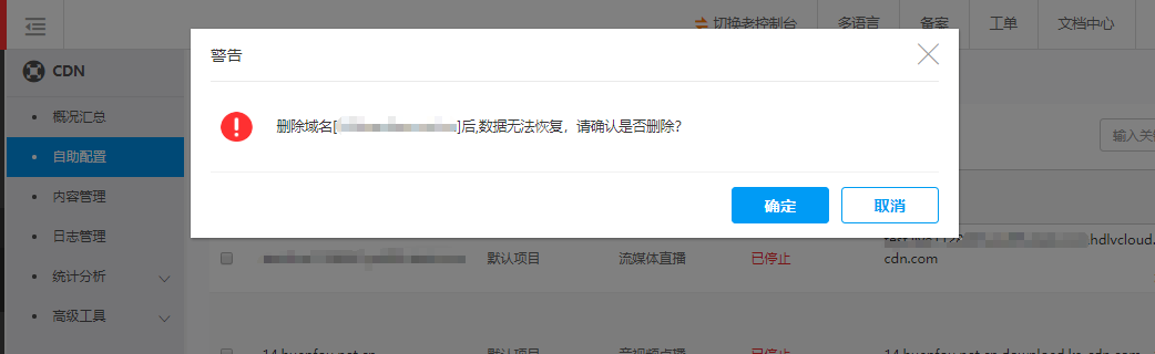 对于在CDN控制台创建的,确定不再使用的域名,可进行删除操作,删除加速域名步骤如下: