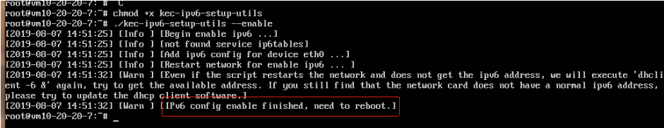 ./kec-ipv6-setup-utils --disable #禁用IPv6need to reboot表示需要重启实例。此提示信息优先度最高,应该忽略其他提示信息,先重启实例。