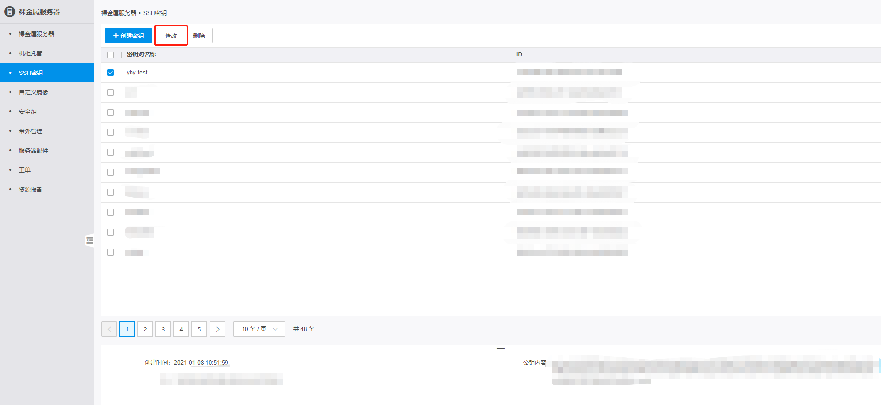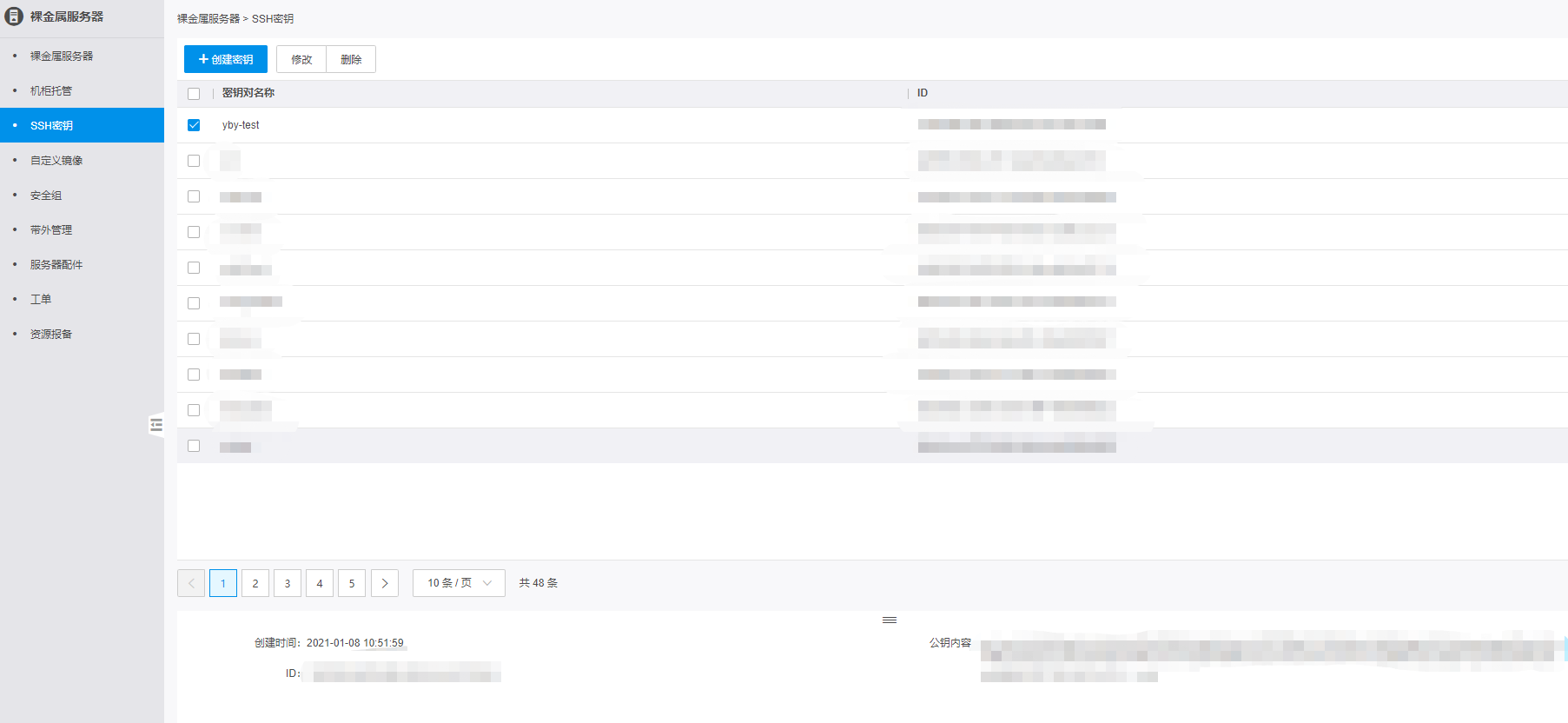 裸金属服务器支持使用SSH密钥对认证登录,用户在创建裸金属服务器时需要指定SSH密钥对,所有已创建的密钥对在SSH密钥页面统一管理。