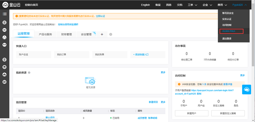 (3)在控制台界面,鼠标指向右上角的用户身份,然后点击Access Keys。