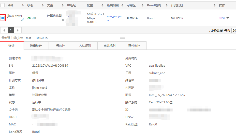 点击您的裸金属服务器进入详情页,在详情页可以对您的机器状况进行监控,包括机器详情、流量统计、云监控、入站规则、出站规则和硬件监控。