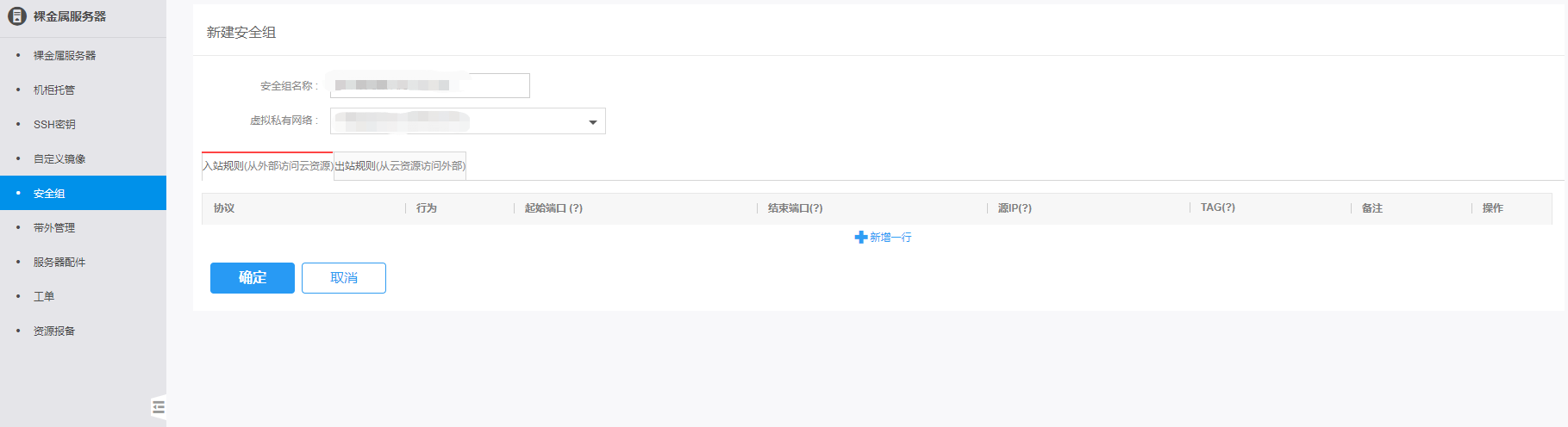 在新建安全组页面,输入安全组名称,选择虚拟私有网络,并配置规则: