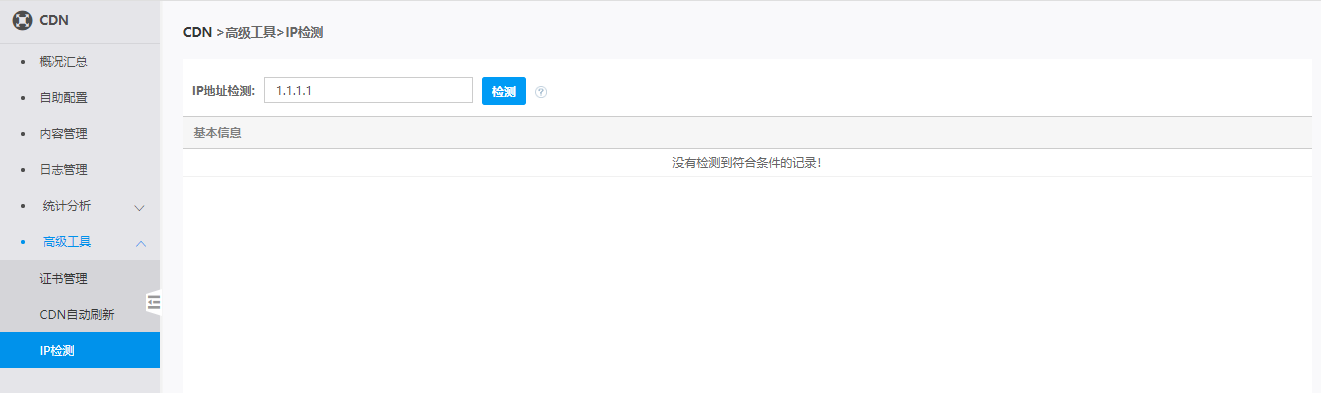 登录CDN控制台,在【高级工具】中找到【IP检测】页面,输入IP需检测的IP地址,点击【检测】,即可对IP地址进行检测: