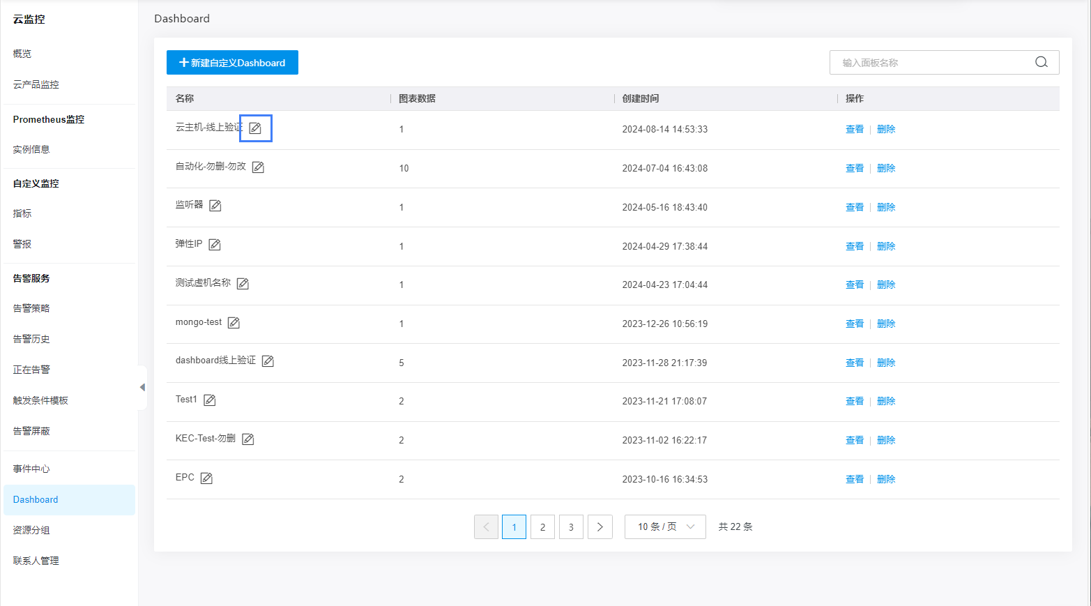 点击名称右侧图标可对自定义面板进行重命名操作。操作列中可点击查看Dashboard详情或进行删除操作。