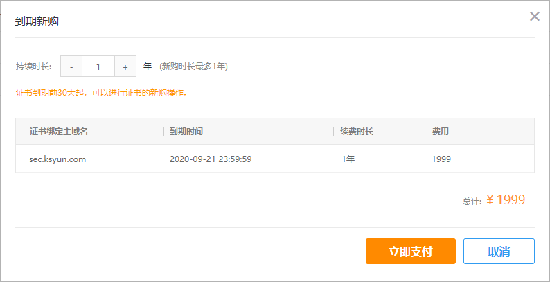 在到期新购对话框中,确认证书各项信息,确认无误,单击立即支付按钮。