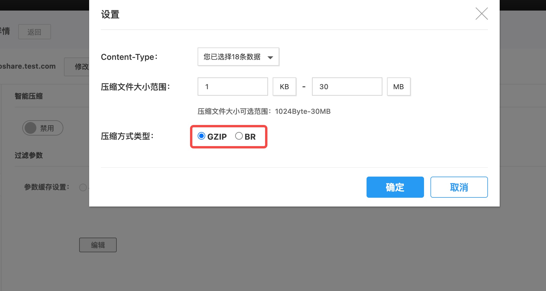 开启后可选择压缩文件类型Content-Type、压缩文件大小范围、压缩方式类型(GZIP压缩或BR压缩)。