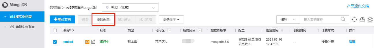 云数据库MongoDB副本集支持在线更改实例配置(CPU、内存及存储容量)和增加只读节点,增加只读节点详见副本集实例增加节点,您可根据业务实际情况对所购买的实例规格进行调整。