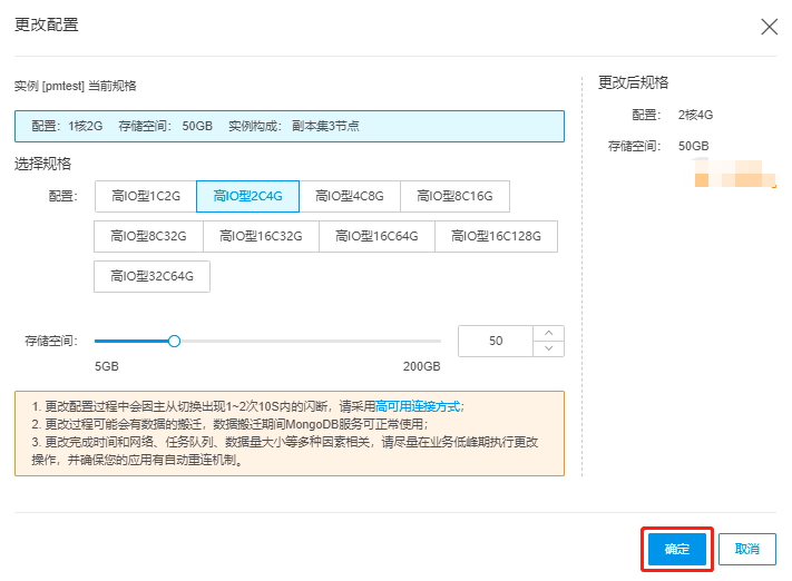 3. 更改配置操作,磁盘大小不能低于已使用的磁盘容量。实例配置变更前后,实例的ID、IP、端口号均不发生变化。