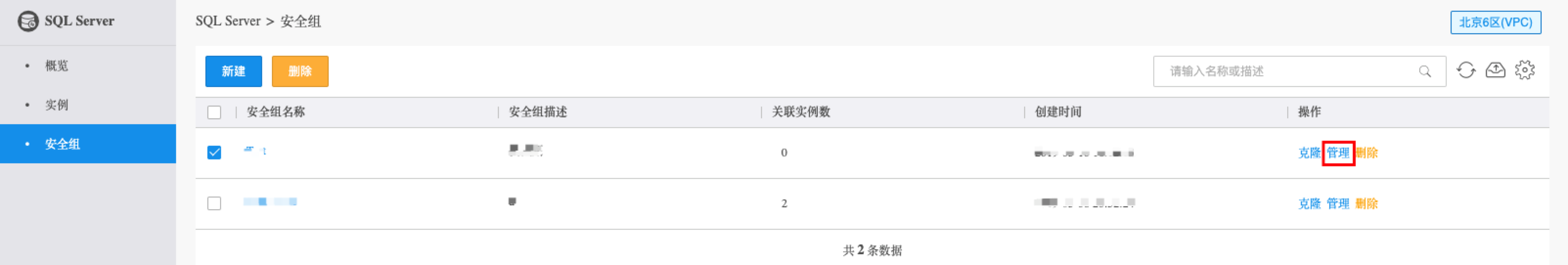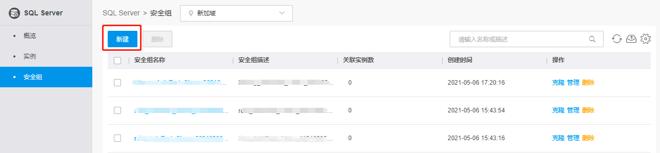 注意:有绑定实例的安全组,不可直接删除,需进入该安全组的详情页,点击实例管理,将所有绑定实例解绑后,方可删除。在安全组页面,点击目标安全组的克隆。