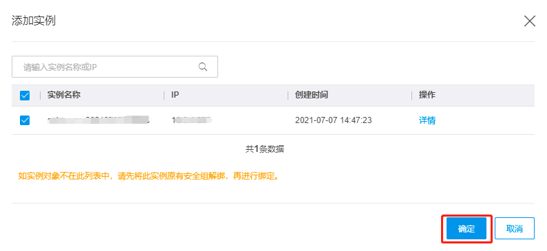 弹出添加实例页面,列表显示此机房账号下的未绑定安全组的高可用、单机和只读实例,勾选实例,点击确定,即添加成功。