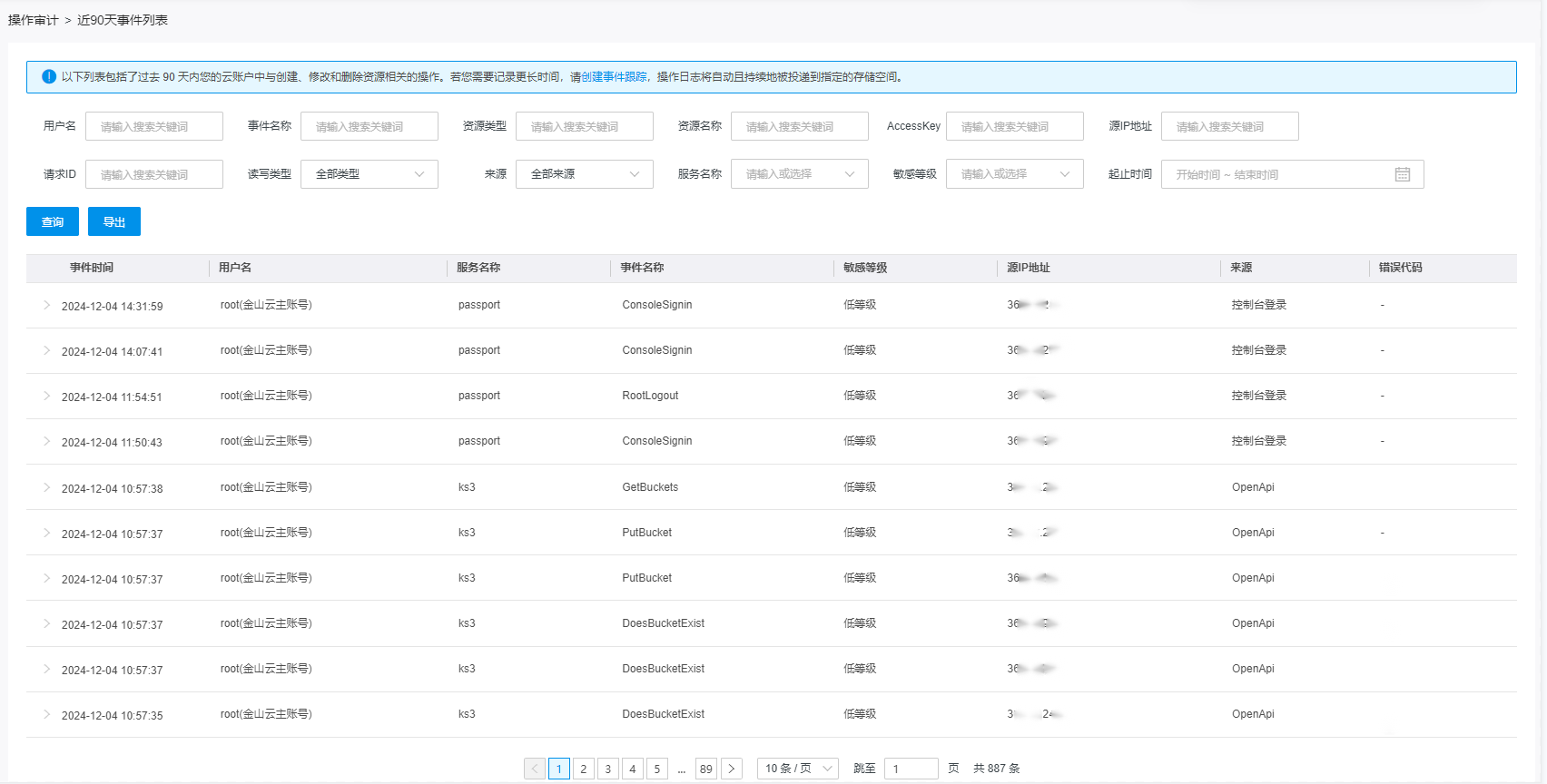 您可以根据用户名、资源类型、资源名称、事件名称 、AcessKeyID、读写类型即对应操作事件时间,获取相关的账户活动。