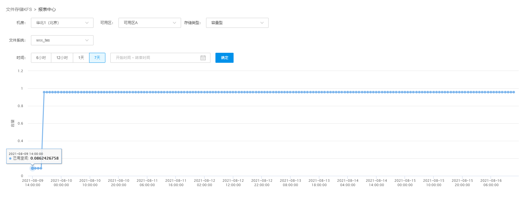 2. 在左侧导航栏中点击报表中心,选择指定文件系统,可查看文件系统的历史用量情况。