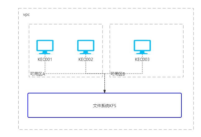 在同一VPC中,有多台不同可用区的云服务器KEC,支持访问在同一VPC中的文件存储KFS。实现跨可用区资源互访。