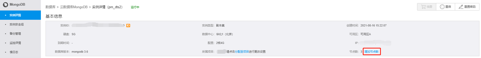 实例增加节点完成后,实例变为运行中。所添加的节点在实例详情页展示,角色均为secondary节点,通过节点ID区分,每个secondary节点会有不同的IP。请按照副本集高可用连接修改连接。