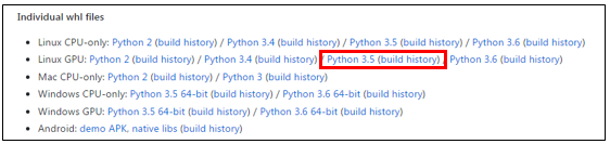 下载对应 GPU版本,这里我们选择python 3.5 版本,得到文件【tf_nightly_gpu-1.head-cp35-cp35m-linux_x86_64.whl】。