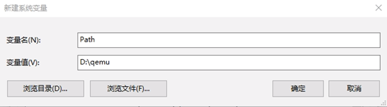 如果是新建Path,在新建系统变量框内,添加Path变量,变量值为D:\qemu。