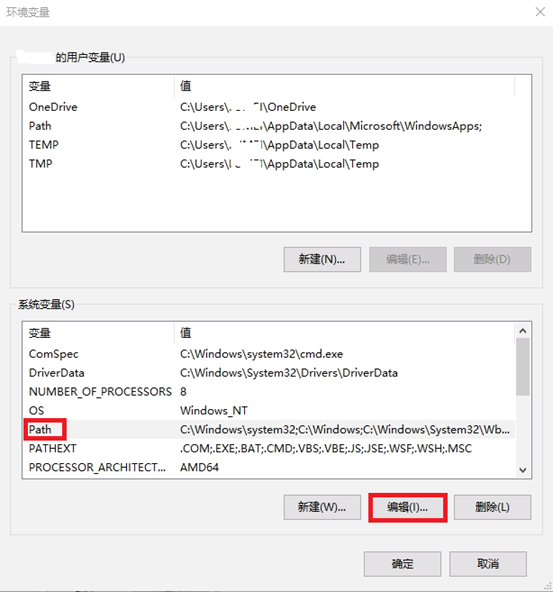 在系统变量中选择Path,再单击编辑。若没有Path,单击新建。