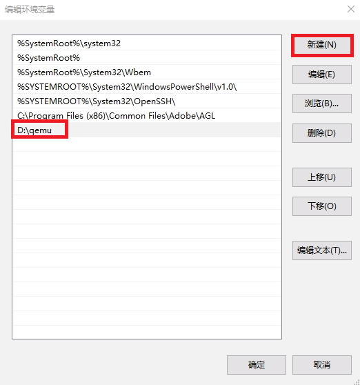 如果是编辑Path,在编辑环境变量框内,单击新建,添加D:\qemu。