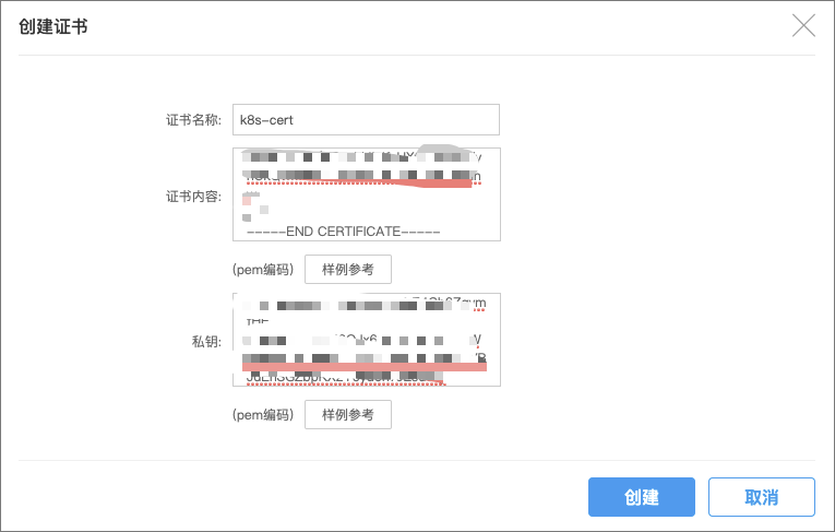 ⅱ.在创建证书的弹窗中,填写证书名称,在证书内容和私钥中上传我们在前提条件中创建的证书和私钥,点击创建,完成证书的创建。