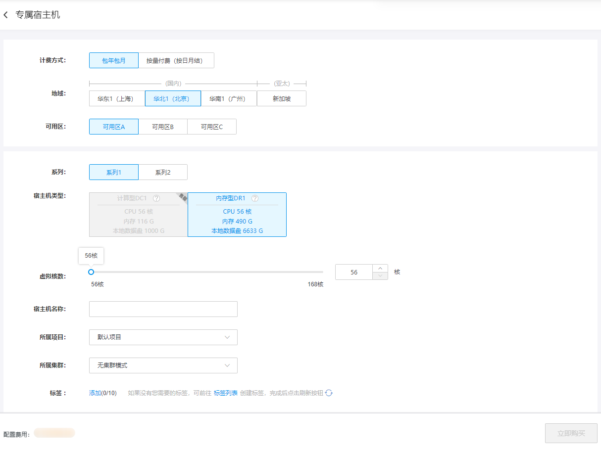 选择计费方式、数据中心、可用区和宿主机类型类型等信息,单击立即购买。