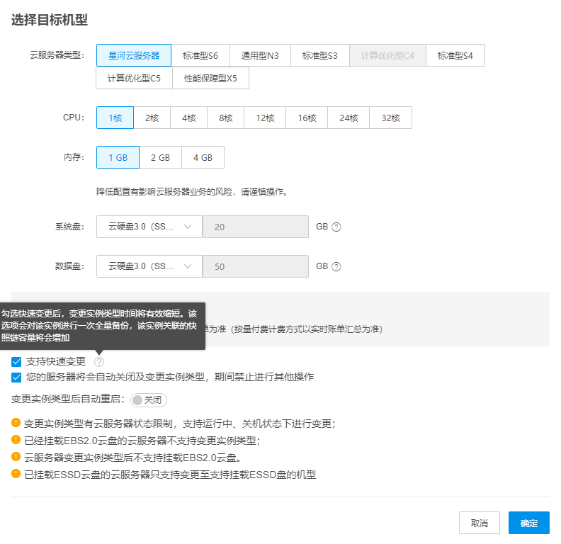 每次只能为一台云服务器或同类型多台云服务器变更实例类型,且变更过程中不能取消操作。