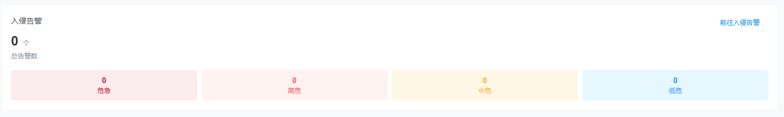 展示当日入侵告警总数量,及危急、高危、中危、低危四个级别的告警分布情况,快速定位高优先级安全威胁。