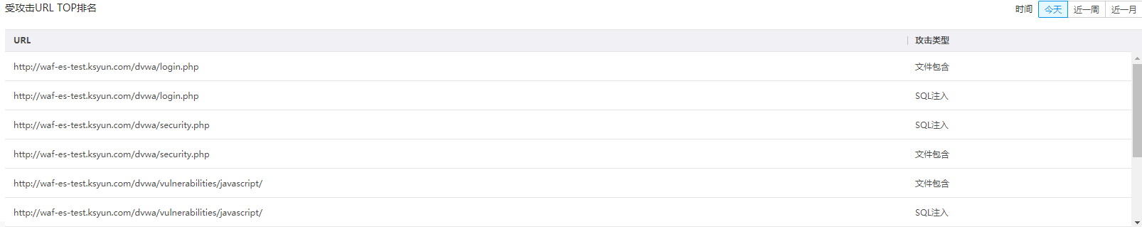 受攻击URL排名数据来源于WAF,展示您账号下web资产的受攻击URL排名情况,支持查询当日、近一周、近一月的URL受攻击情况