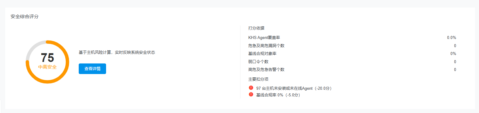 安全评分基于您账号下资产的Agent覆盖率、漏洞修复状态、基线合规率、弱口令数量、高危告警处置情况等多维度加权计算得到100分制评分,实时展现当前整体安全状态。无入侵告警时默认评分60分以上,评分结果将标注主要扣分项及对应修复建议,直观反映资产安全短板。
