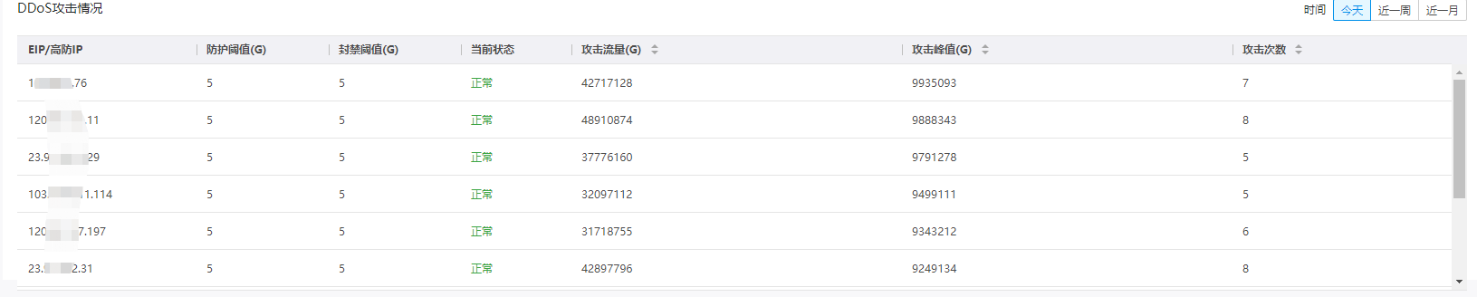 DDoS攻击情况为您展示公有云弹性IP的基础防护情况和高防IP的DDoS攻击统计信息,您可以查看今天、近一周、近一月的DDoS攻击情况。
