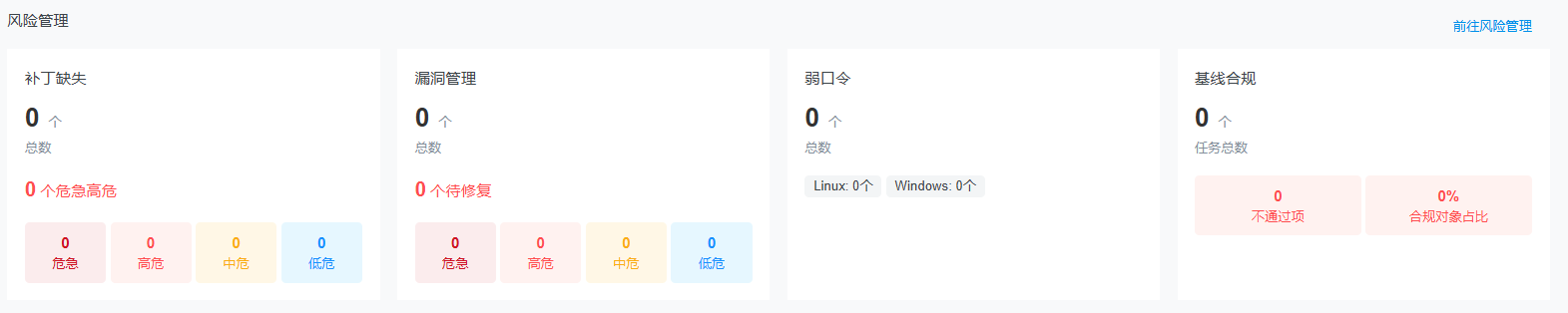 点击“前往资产管理”“前往风险管理”“前往入侵告警”等按钮,可直接跳转至对应功能详情页,进行资产管控、风险处置、告警响应等操作。