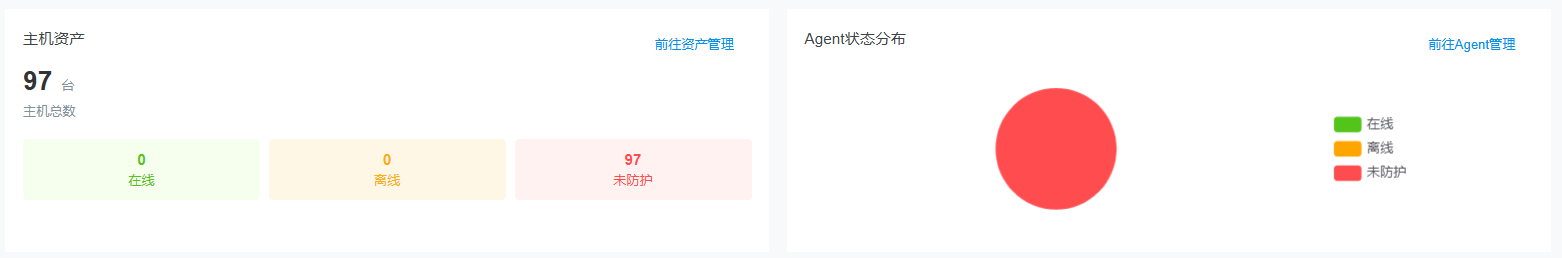 呈现账号下主机资产总数,及在线、离线、未防护三种状态的资产分布数量,清晰掌握资产防护覆盖情况。