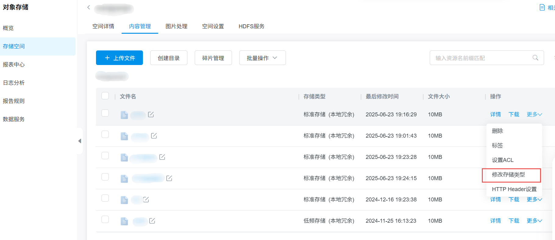 4. 鼠标选中目标文件后,点击文件列表上方批量操作中的修改存储类型。