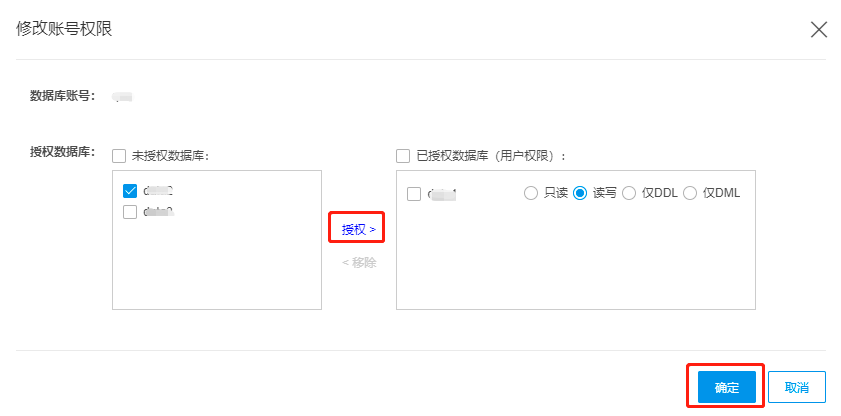 在左侧未授权数据库中,勾选要添加权限的账号,点击授权。