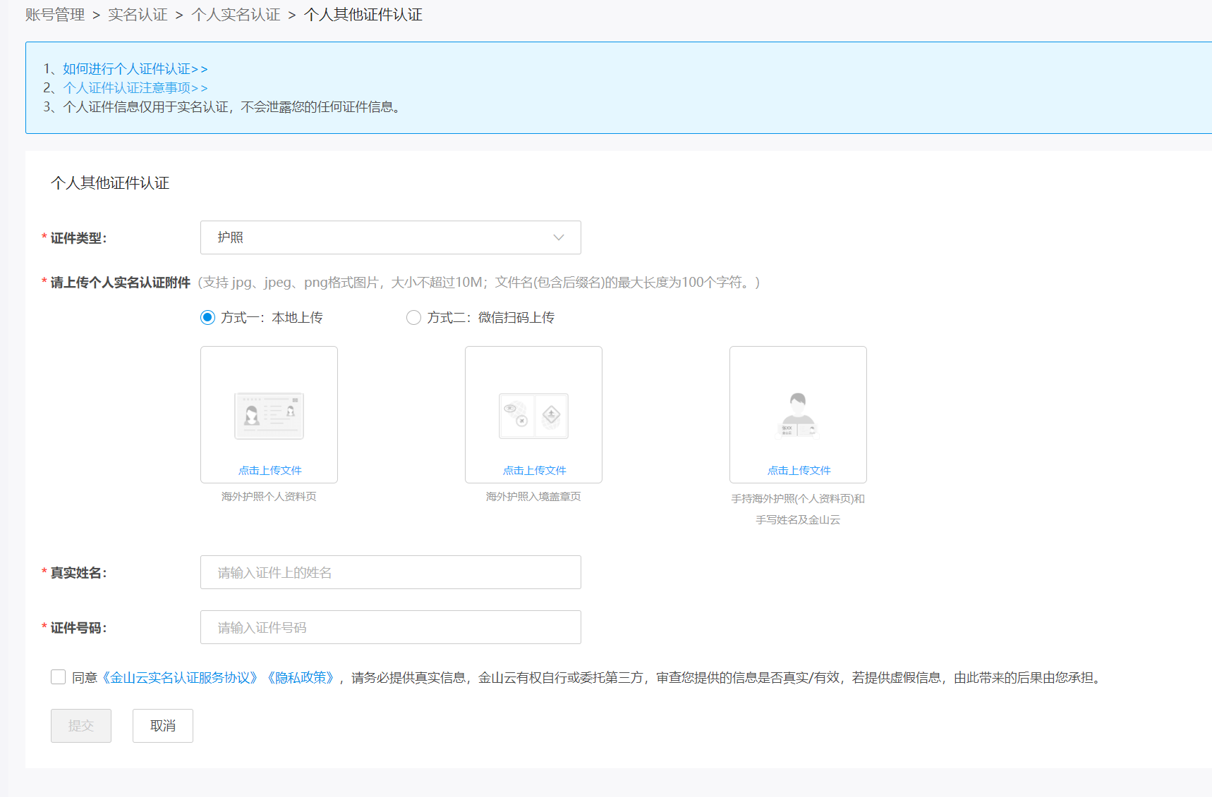 1.登录控制台首页,进入实名认证页面。2.在认证类型页面选择个人实名认证,进入到下一步。3.在认证方式页面选择个人其他证件选项。4.在个人其他证件界面填写按提示填写相关信息。5.点击提交,请等待金山云审核。预计1~2个工作日内完成审核。