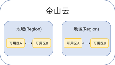 地域和可用区是指金山云提供的资源所分布的物理位置,其关系如下图所示: