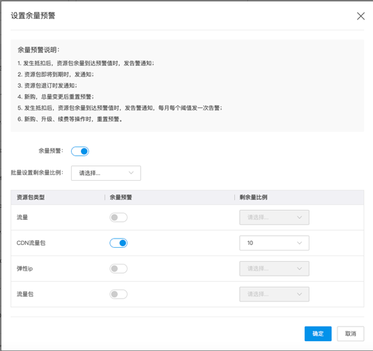 在资源包概览页面右上角,点击右上角设置余量预警,进入设置页面。