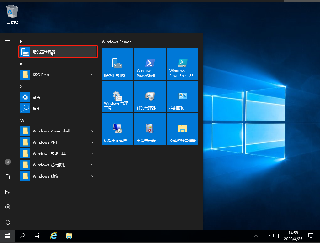 通过控制台连接实例,打开开始菜单,找到并单击打开“服务器管理器”