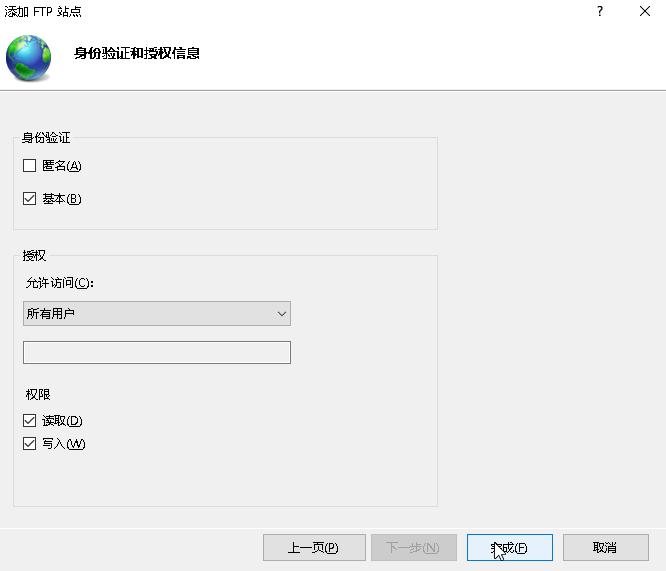 身份验证选择“基本”,授权选择“所有用户”,权限勾选读取和写入(可以按照自己的需要选择授权),点击完成即可完FTP的配置(如果弹出:此网站不存在,请刷新网站列表。点击左侧菜单栏的网站的“+”号即可)。