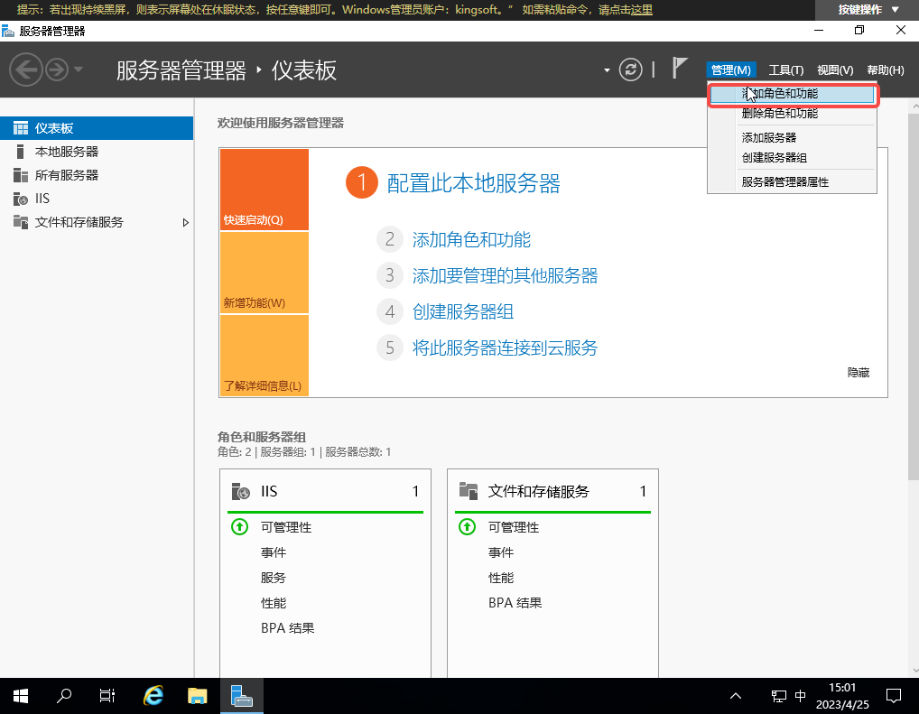 选择“添加角色和功能”(如果没有添加角色可能是服务器管理器没有读取完全,稍等片刻即可)