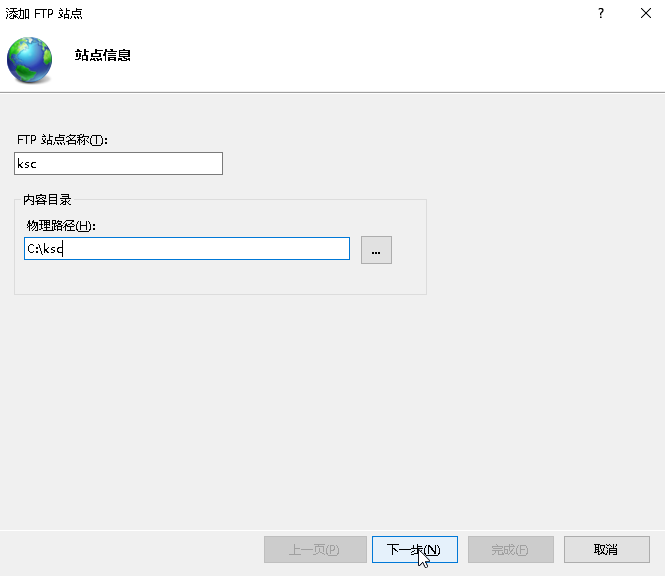 输入一个FTP站点名称,并为其添加一个物理路径,点击下一步: